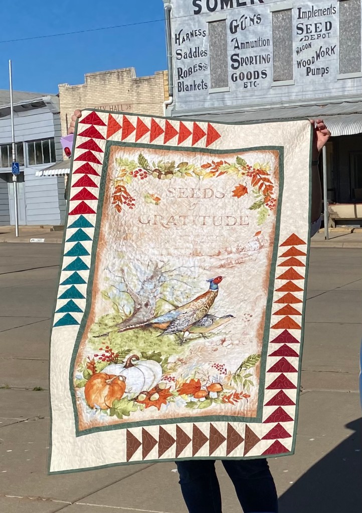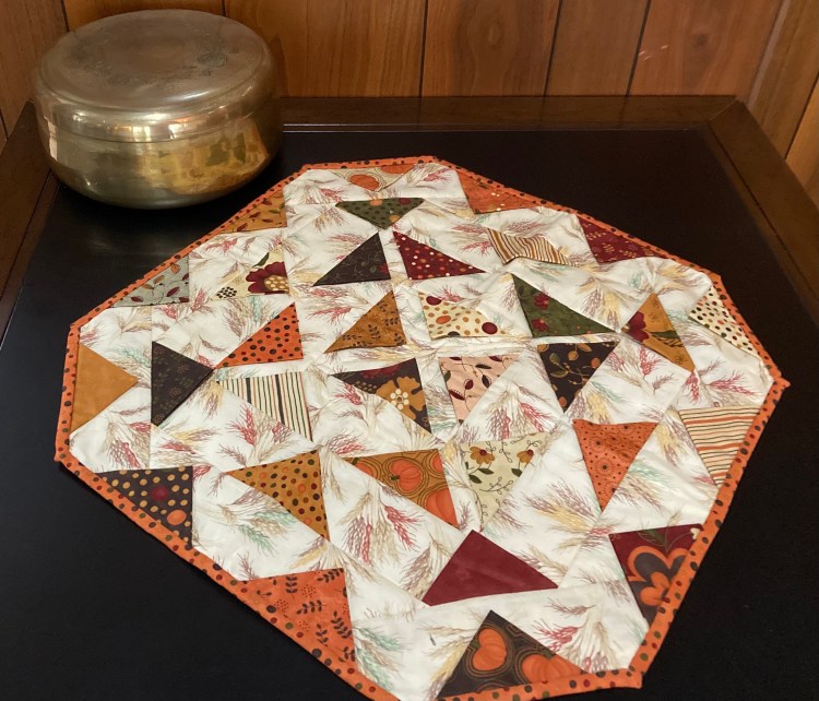 This unusual table topper used Deb Strain fabric for the 3-D prairie points and binding. It measures 20″ x 20″ and is for sale for $50.
