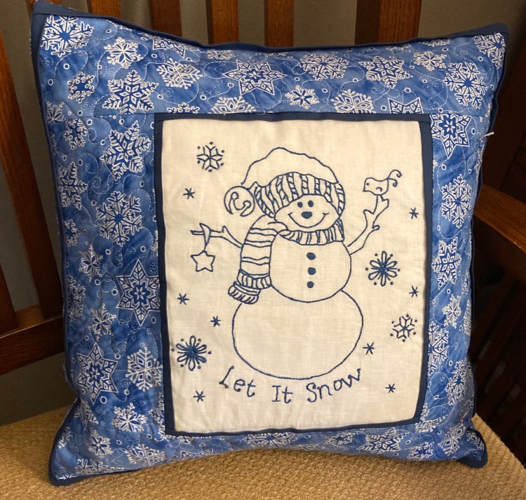 Snow people and January and February go together. This guy is reminding us to enjoy the snow. The pillow is 14″ x 14″ and has an envelope opening. It is $30.