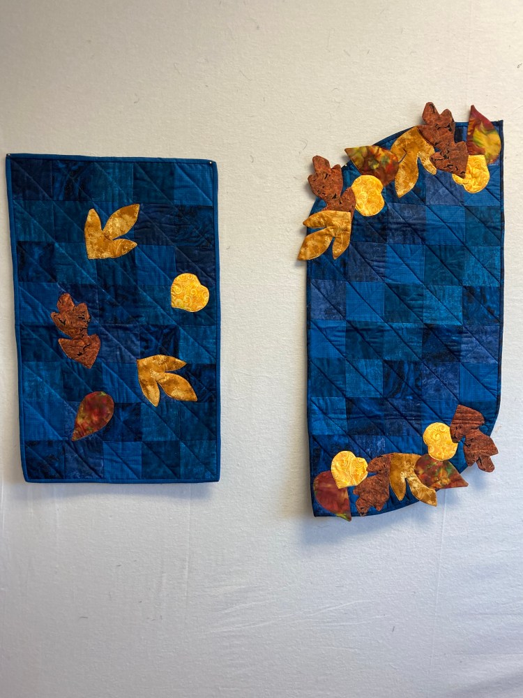 The colors of these table toppers or table runners suggest the deep blue of a autumn sky. The appliquéd leaves are rich batik golds and browns. The topper to the left is $25 and the one on the right is $30.