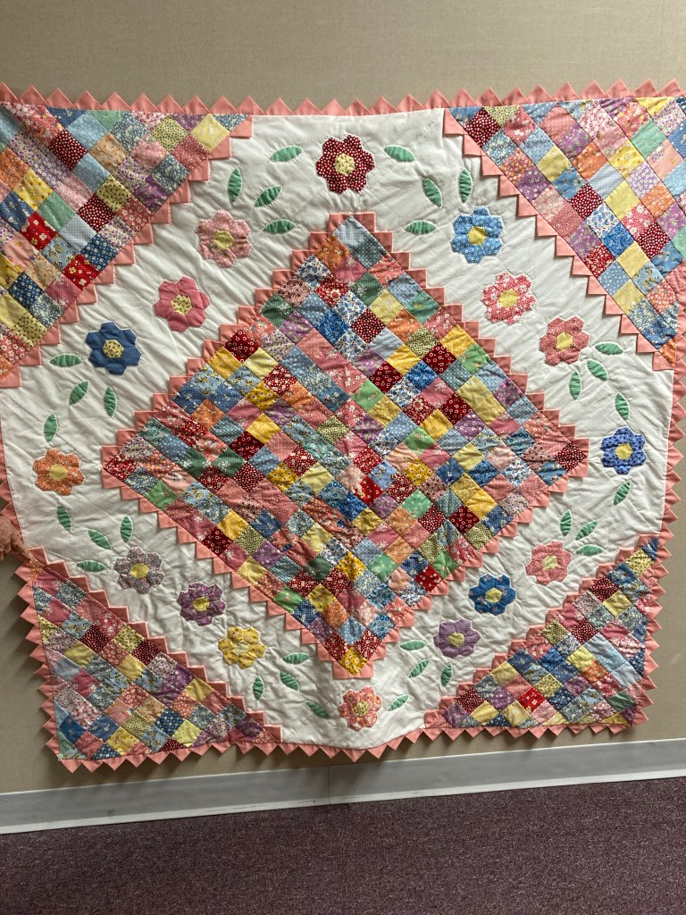 Ida C., one of the original members of the First Quilters made this floral baby quilts or table topper or throw. Reproduction 30’s fabrics were used in the patchwork and in the applique. Prairie points surround this quilt. It is both hand and machine quilted. It is $200.
