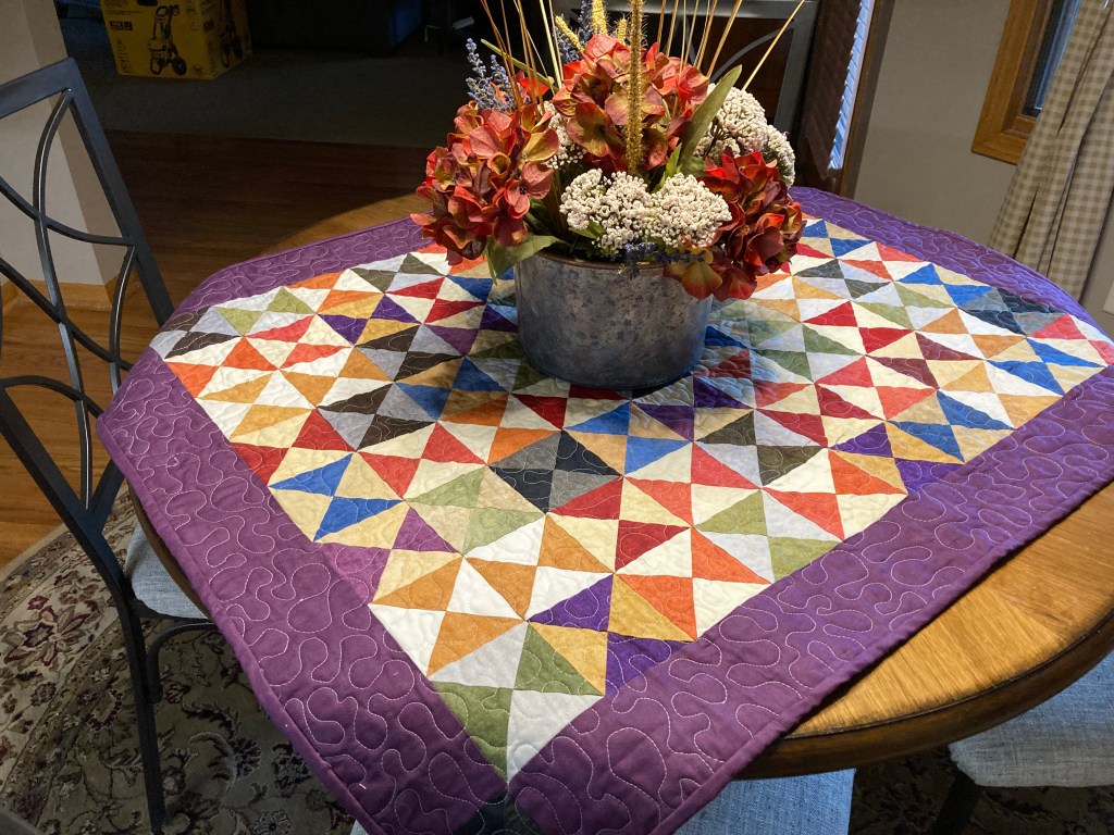Hour glass blocks surrounded by a purple border is perfect for tables in October and November without screaming fall! It is for sale for $50.
