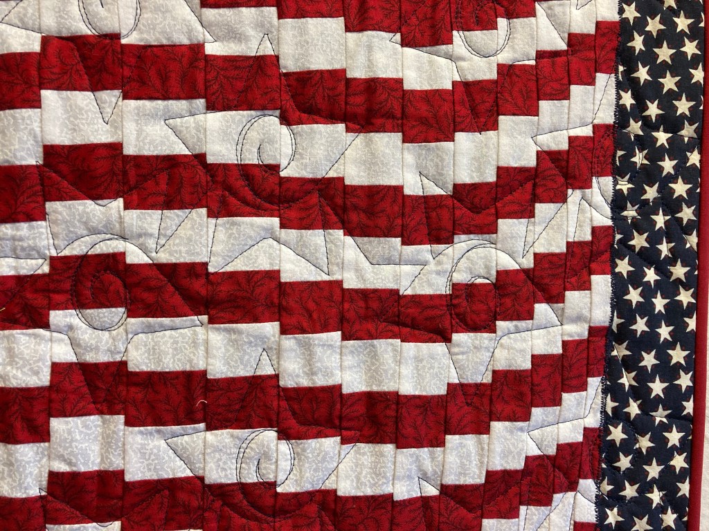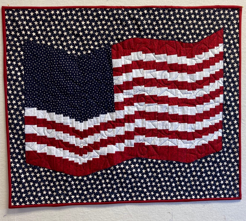 Right in the middle of summer–our National Holiday! This bargello flag can be hung on your door, the deck or above the mantle. The flag is appliquéd onto the star background and measures 24″ 29″. It is $40