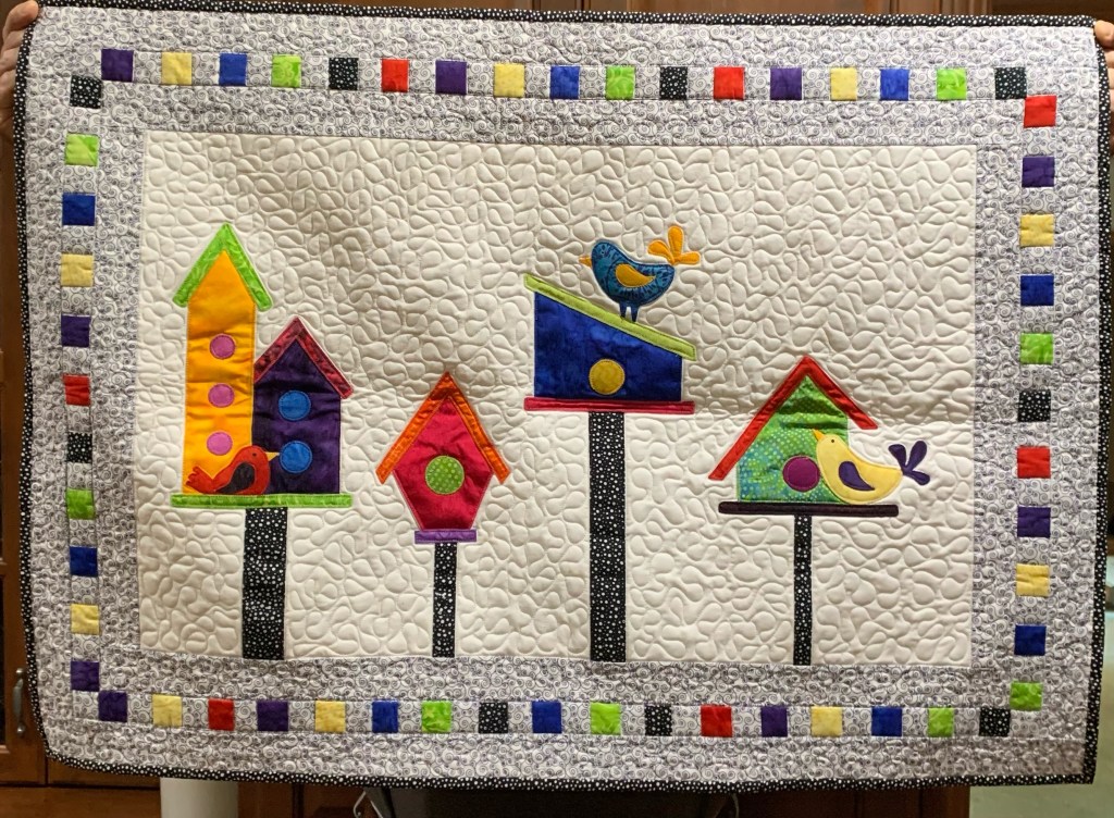 The early morning sounds of birds is especially a plus in the summer. Although you may not see these birds on your walk, this wall hanging in your home is a happy reminder of summer. “Tweet Tweet Condo” is 36″ x 26″, machine appliquéd and custom quilted. $100