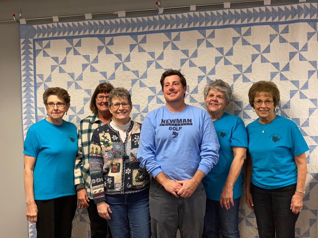 This past Wednesday we celebrated our 2021 Quilt Sales. Traditionally we have a luncheon and invited church staff and present our checks to the representatives of the TV Ministry and the Religious Nurture Center. COVID prevented us from having the delicious luncheon—–but both groups of quilters did met with the head minister and the director of RNC to announce the amount of our gifts.