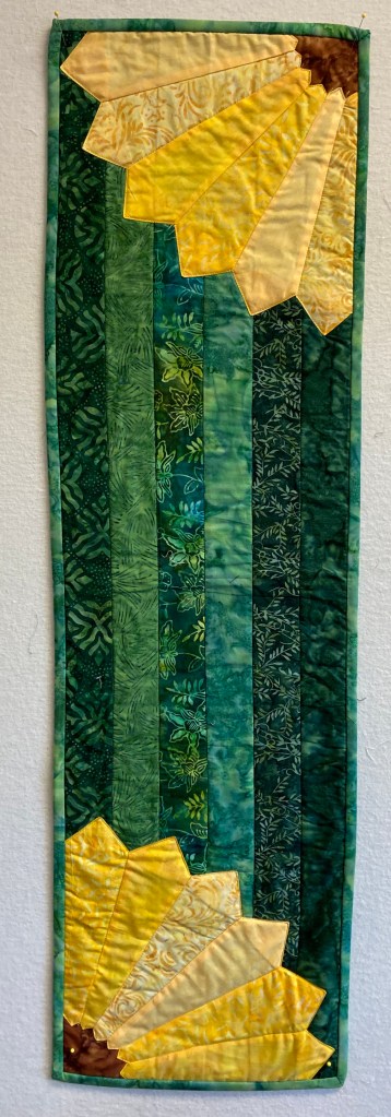 This table runner is 12″ x 42″ and made from various batiks. The sunflowers win the diagonal corners are “Dresden petals”. Dresden quilts were very popular during the 1920-30’s, but have been adapted into contemporary designs. The runners is $40.