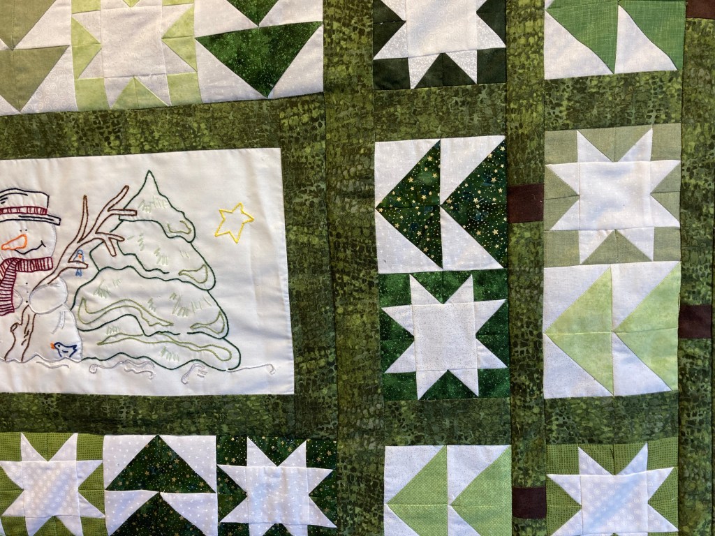 Shades of green fabric was used to create the framework of sawtooth stars and flying geese. The table runner is 22″ x 57″ and would fit into your decor all winter long.