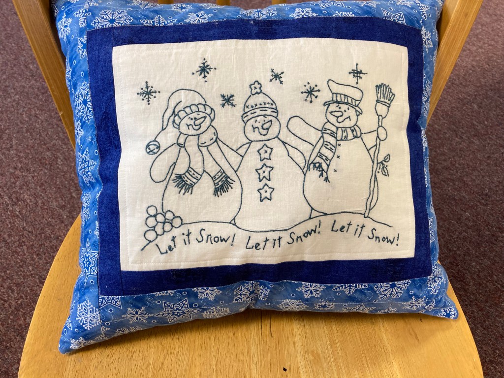 The pillow is approximately 15″ square. The snow people are hand embroidered. The pillow is machine quilted. It is $30.