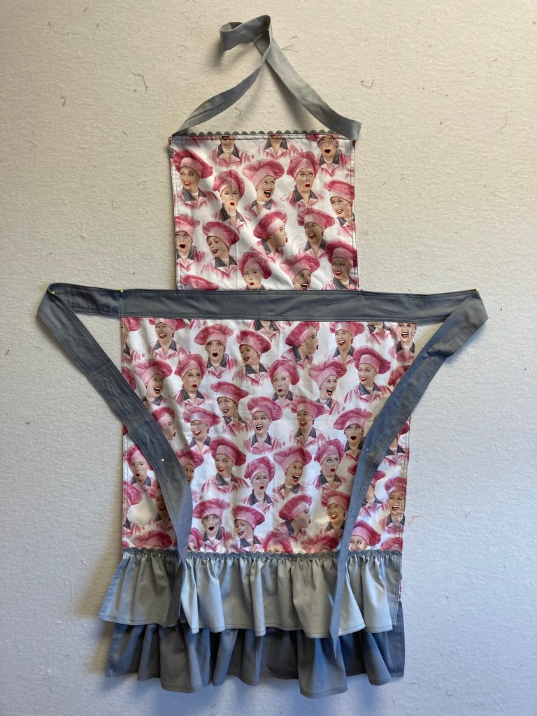 Phyllis S. made a full apron with her Lucy fabric. It is pink and grey–very fifties! She even used ric rac.