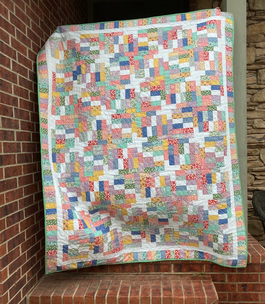 It is a “sort of” scrappy nine patch. The borders and binding are from the same jelly roll collection. The quilting is “Baptist Fan” –Measuring 65″ x 73″ and for sale for $250