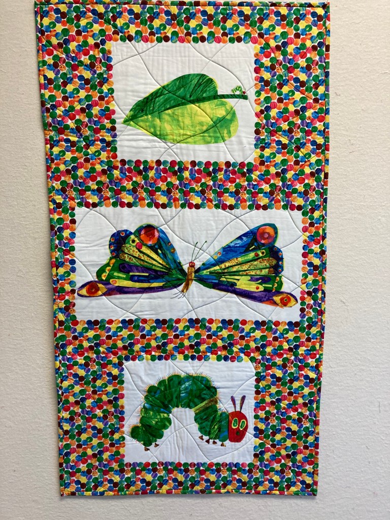 The Very Hunger Caterpillar would brighten any child’s room as either a wall hanging or runner on top of a chest of drawers. Janis added a new copy of the Very Hunger Caterpillar board book. This is $50. I didn’t get the exact size but it is approx. 20″ wide and 45″.