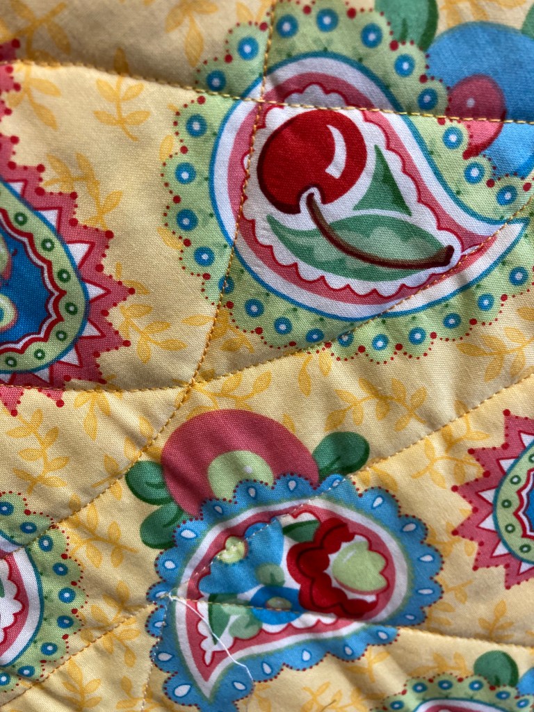 I pitted “bushels” of cherries for my Grandma Ella—well, maybe not bushels but lots! But every company meal at her house ended in wonderful cherry crisp for dessert. Now I look forward to fresh cherries from Washington in the summer. This table topper has several cute cherry prints for a summer vibe. The backing could also serve to brighten up your table. 39″ x 39″ and $50.