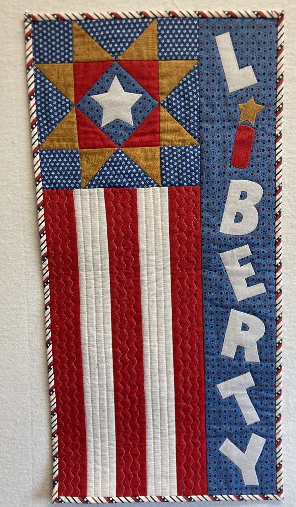 Hang this on your front door or in a hall way and you are ready for the Fourth of July. Can you tell that this is another Janis creation? The perfect appliquéd letters give it away! It is 15″ x 30″ and for sale for $60.