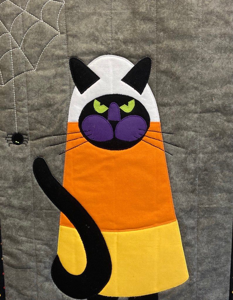 Corny Cat could only be a black cat. The black tail is impatiently flipping his displeasure. Corny is 13.5″ x 18.5″ . Machine appliqué and embroidered. $50. SOLD