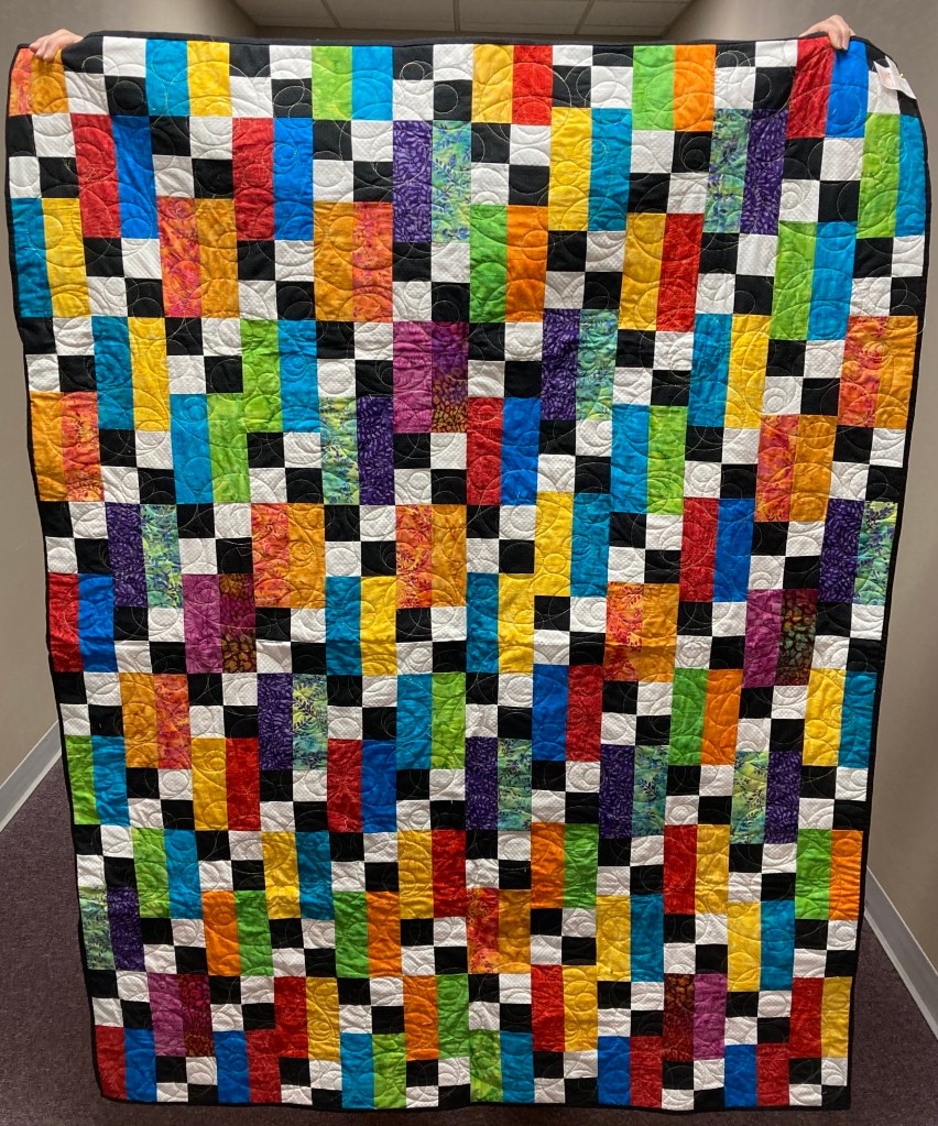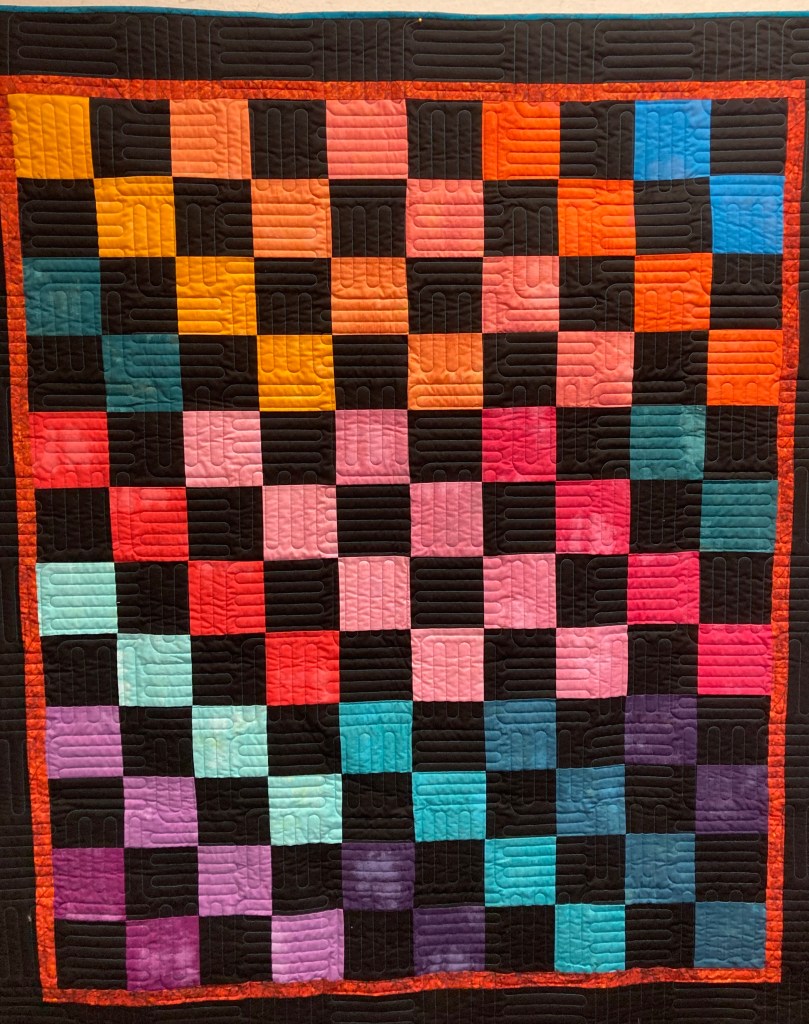 Two charm packs and black yardage in a checkerboard design with some modern quilting resulted in this striking lap quilt or large wall hanging. The quilt measures 53″ x 63″.
