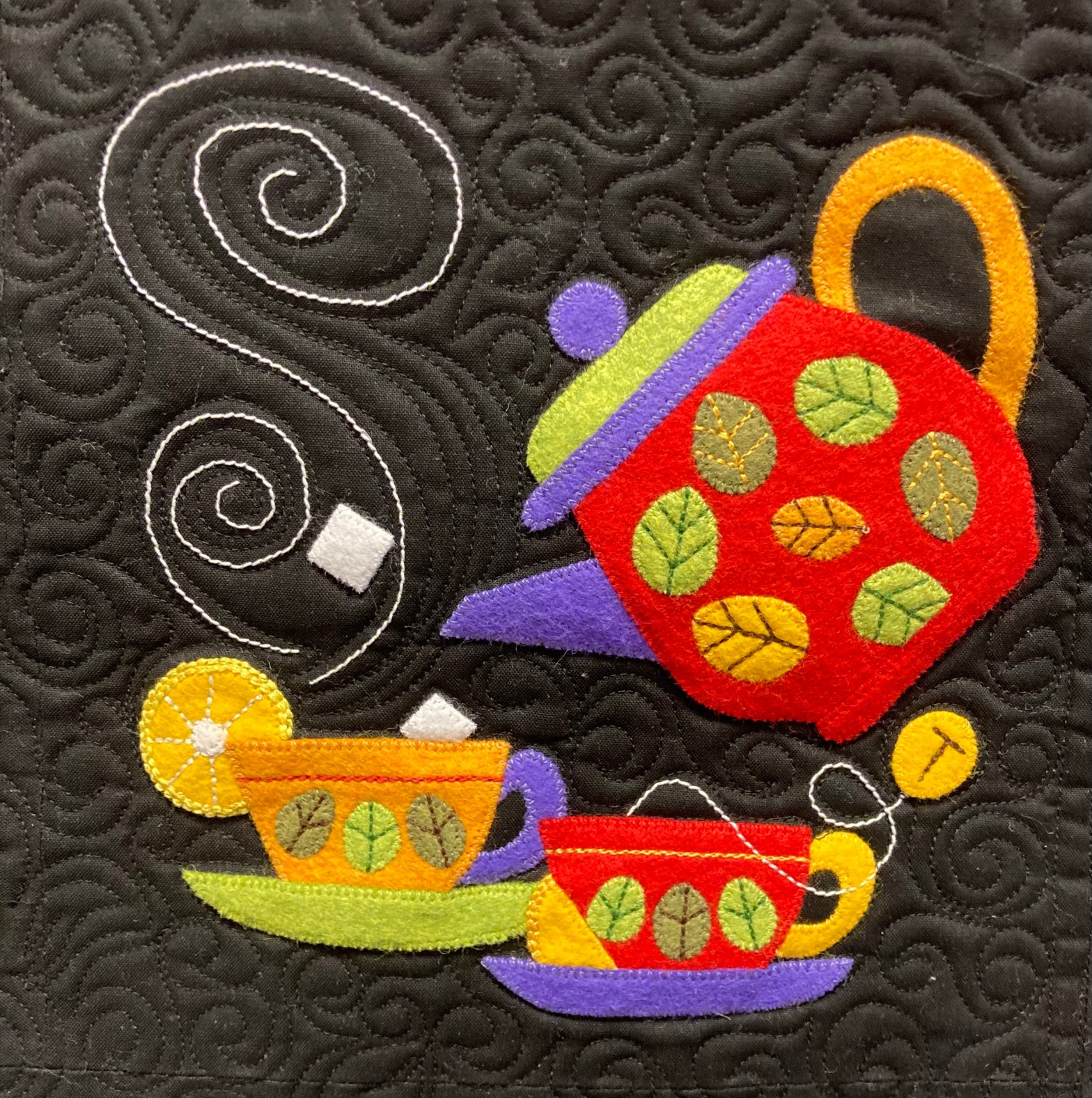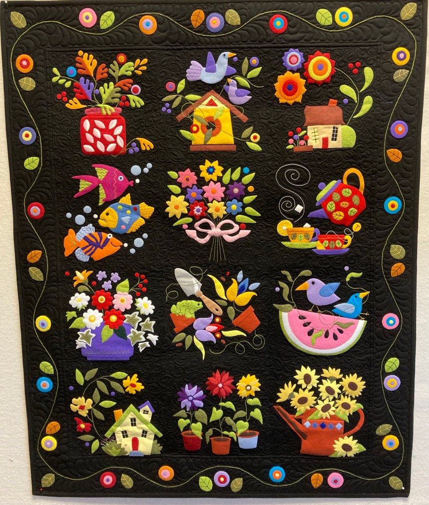 Machine appliquéd — bright wooly flannels on a black background. Janis bought the pattern but choose her own colors using the pattern as a guide. Look at the details.