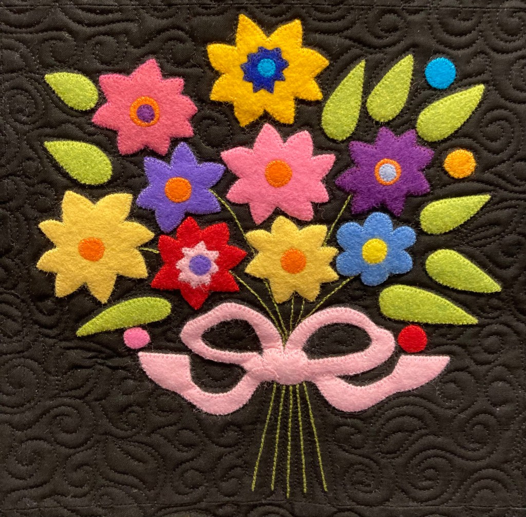 Machine embroidery and custom quilting added the final touch. It is in a good home–the owner appreciates the color and workmanship. But guess what? I saw Janis working on something similar for next year so keep on the look out!