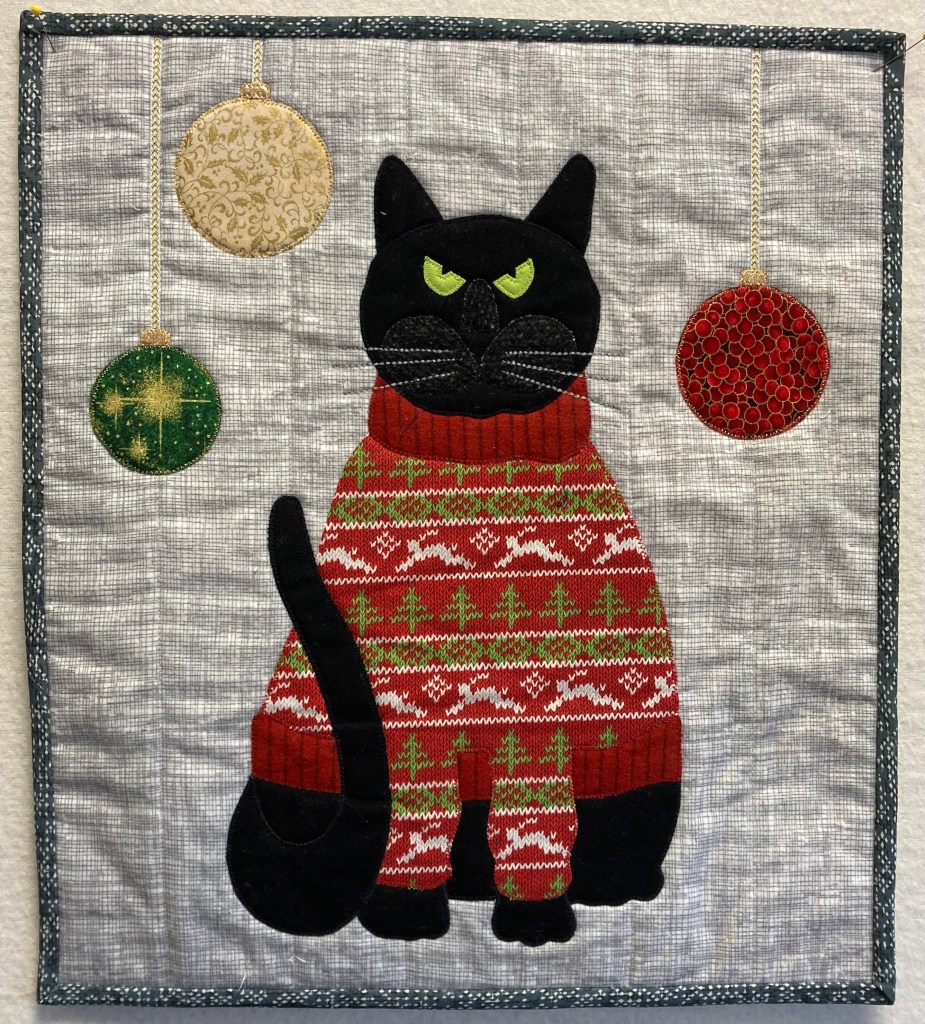 Look who is here again! This time he was dressed up in a Christmas sweater! (It is fabric, not knit) Not happy! But only a black cat could look this handsome in this sweater. 14″ x 19″. $50. SOLD