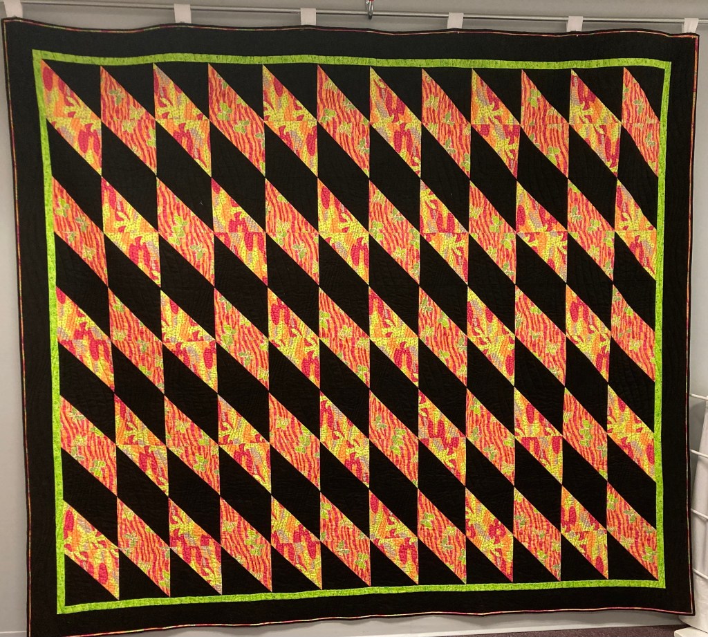 Just two coordinating prints, a complimentary lime green and black!! The simple half-square triangle was manipulated to create a “parallelogram” on point. Lime green is a trademark of Paulette who made this beauty. The binding is made using the two fabric technique creating a faux flange.