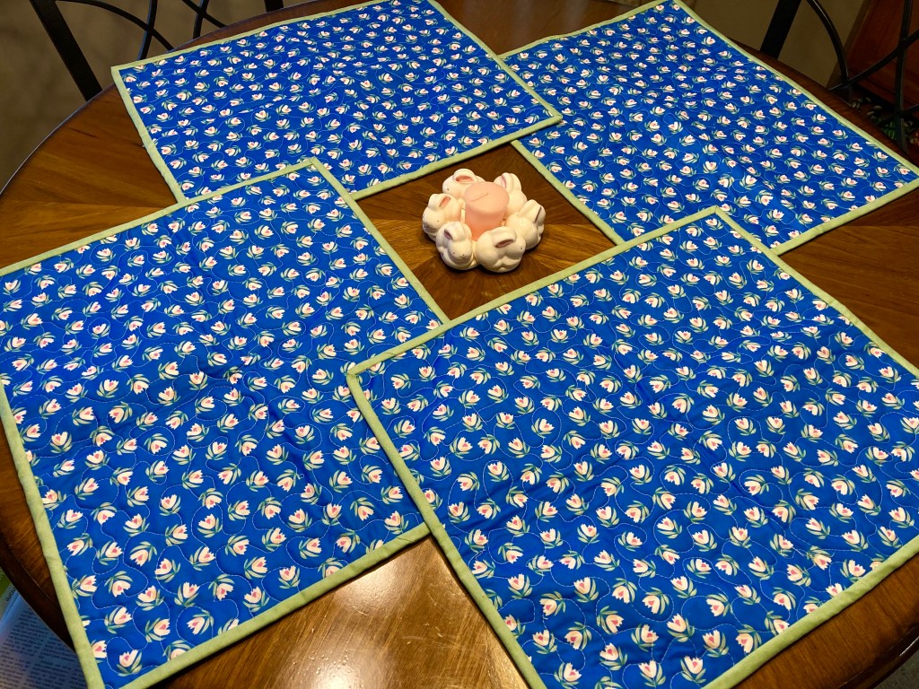 Tulip print placemats. Approximately 15″ x 18″. Back is pink gingham print. Machine quilted and washable. 4 for $40.
