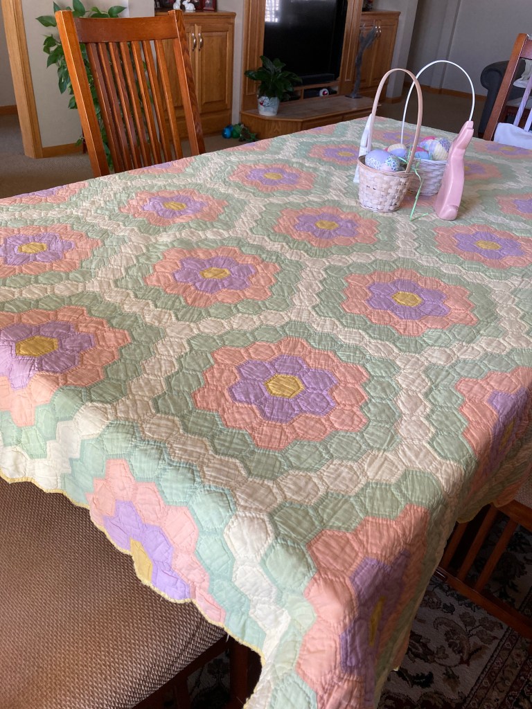 I purchased this quilt at a farm sale. The owner did not know where and when his late wife had purchased the quilt. Every spring when I bring this “flower garden” out, I wonder about the maker. It isn’t a scrappy quilt–the fabric was purchased especially for this quilt. But the fabrics suggest it was between the 1920-1940s, when many experienced financial hardships. What was the occasion? Was it in a “Hope Chest”? Did a group of quilts meet weekly around a frame to hand stitch around each hexagon?