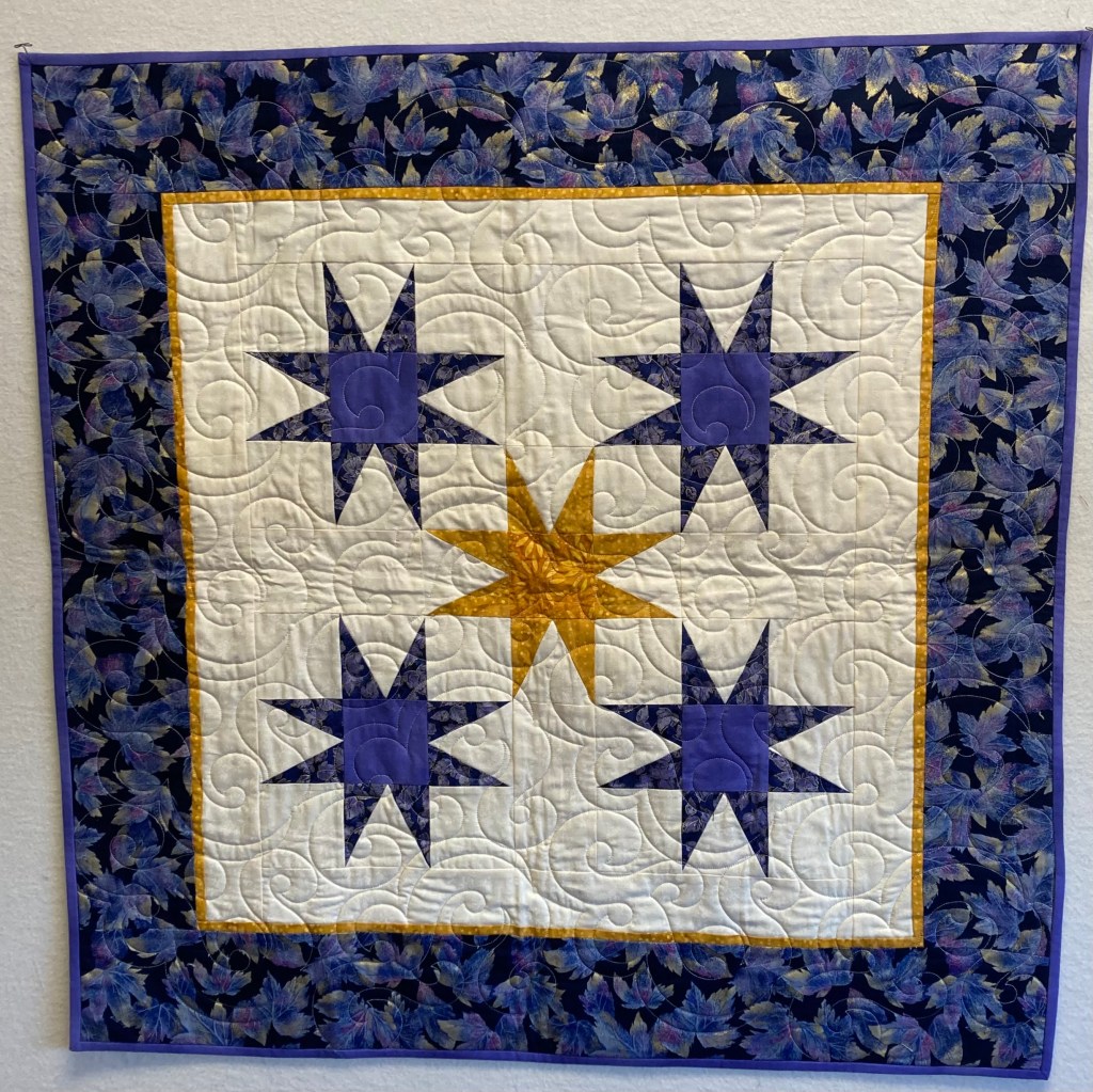 The table topper or wall hanging is 35″ x 35″ and machine quilted using the “scrollwork” pattern. $45