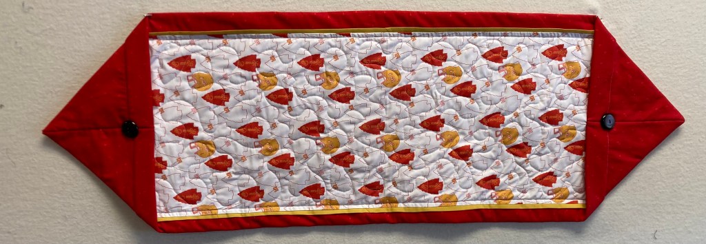 This table runner doesn’t say KC Chiefs because isn’t official licensed fabric—but the arrow heads are red and gold with “you know who’s” number 15 ! It is 13.5″ x 40.5″ and is machine quilted. It is washable. $40