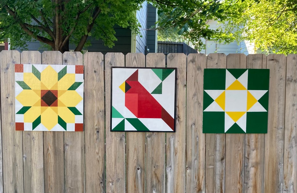 You don’t need a barn to hang a barn quilt–we hung ours on the back fence. The barn quilts painted for the sale are $50 each.