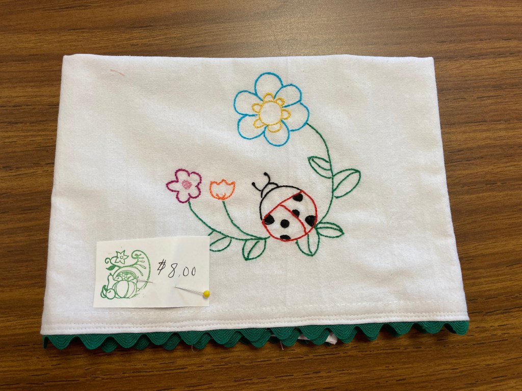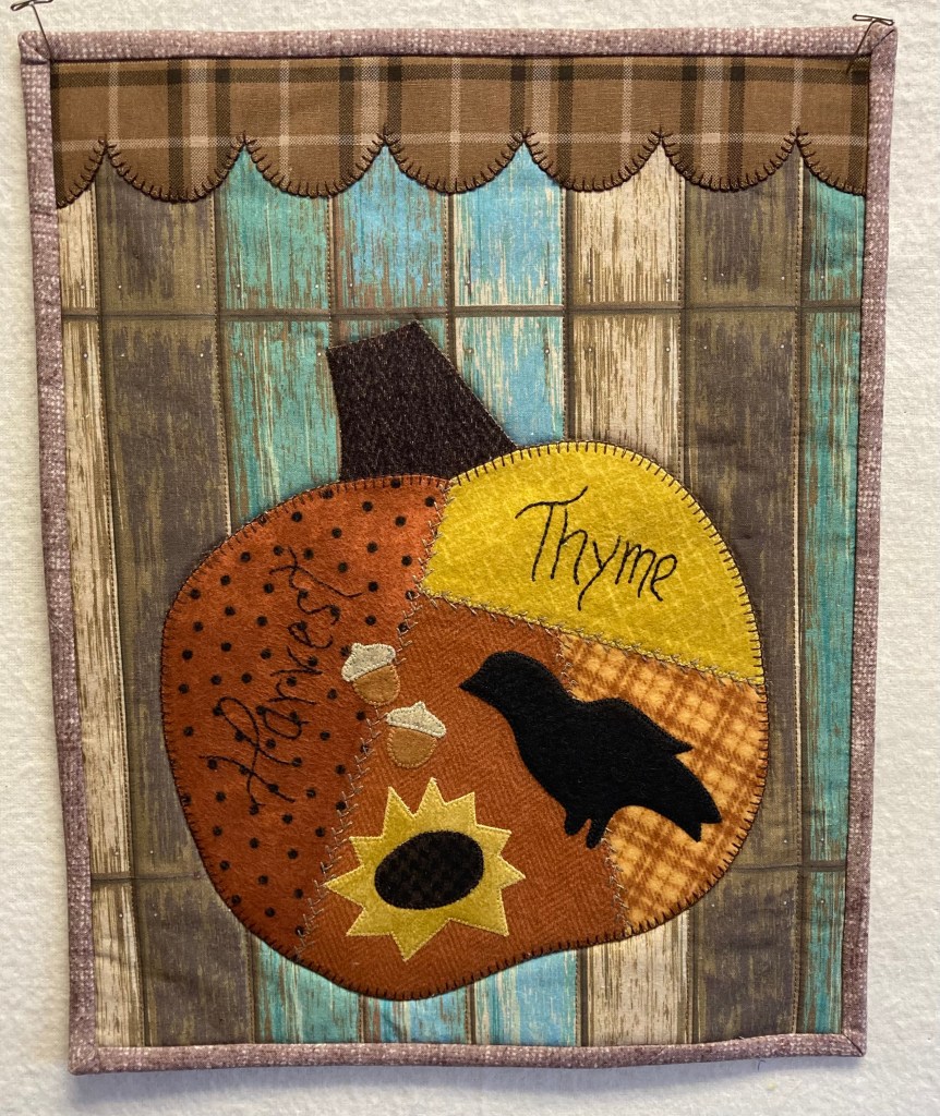 Autumn is pumpkins, sunflowers and rustic barns –maybe not always in “real” life, but in our dream world, yes! This 12″ x 15″ wall hanging was created with that in mind. Look at the fabric used for the background..wow. Decorative stitches were used to appliqué. Size is good for anywhere in your home. $50