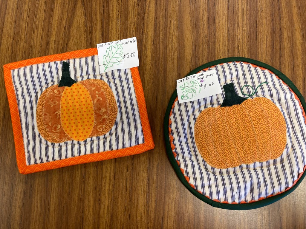 Pot holders or trivets have appliquéd pumpkins on a Insul-brite batting. The background is a durable ticking.