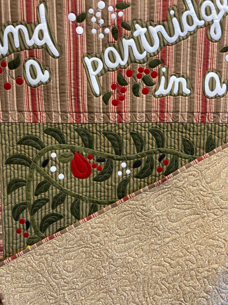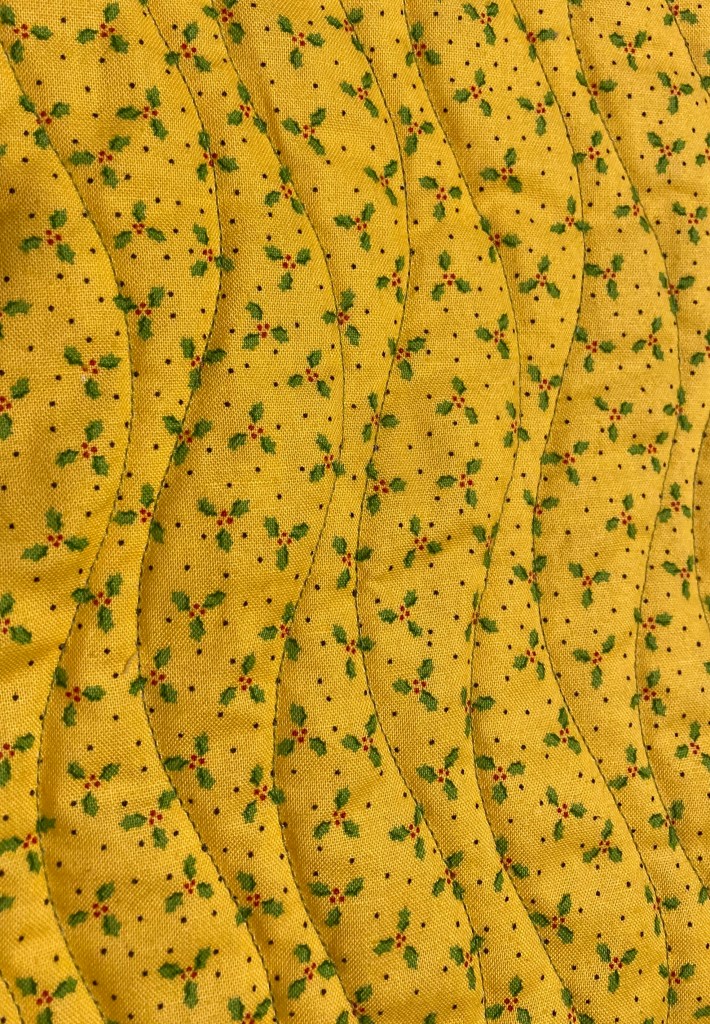 A holiday print is used for the backing. It is machine quilted and hand bound.
