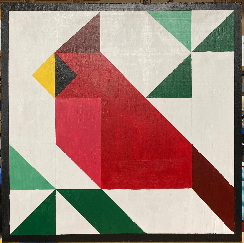 April chose the patchwork pumpkin with the black crow and I stayed with my favorite, a Cardinal. Each is 28″ x 28″. The boards are 1/2 inch plywood that has been coated on both sides with primer. After the design is complete, two coats of a clear top coat are spray on to help make it weather proof.