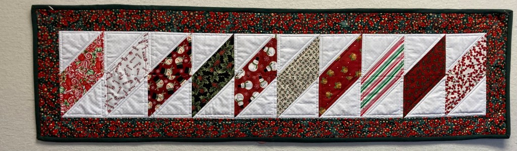 This beautiful print is simply quilted in a cross-hatch (one of my very favorite designs). But it is the curvy edges that sets it apart! 14″ x 40″. $40