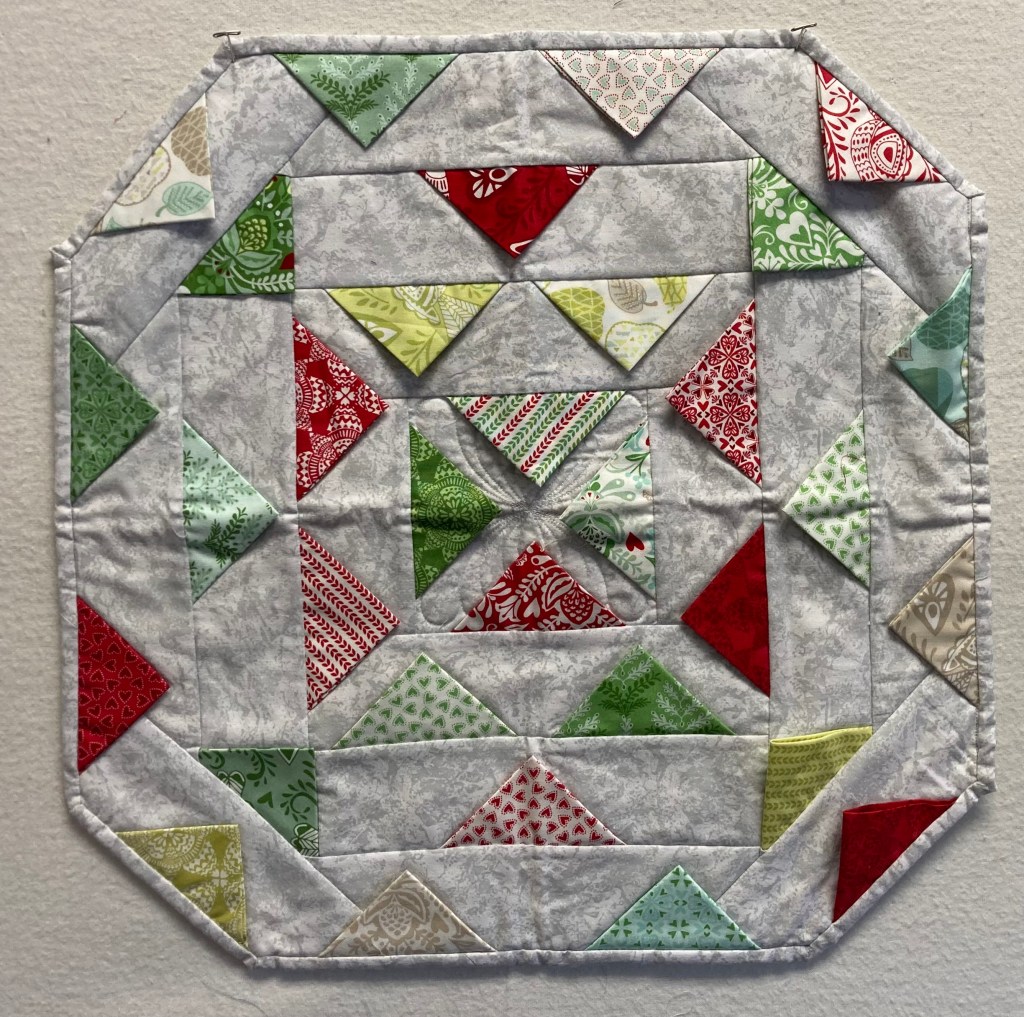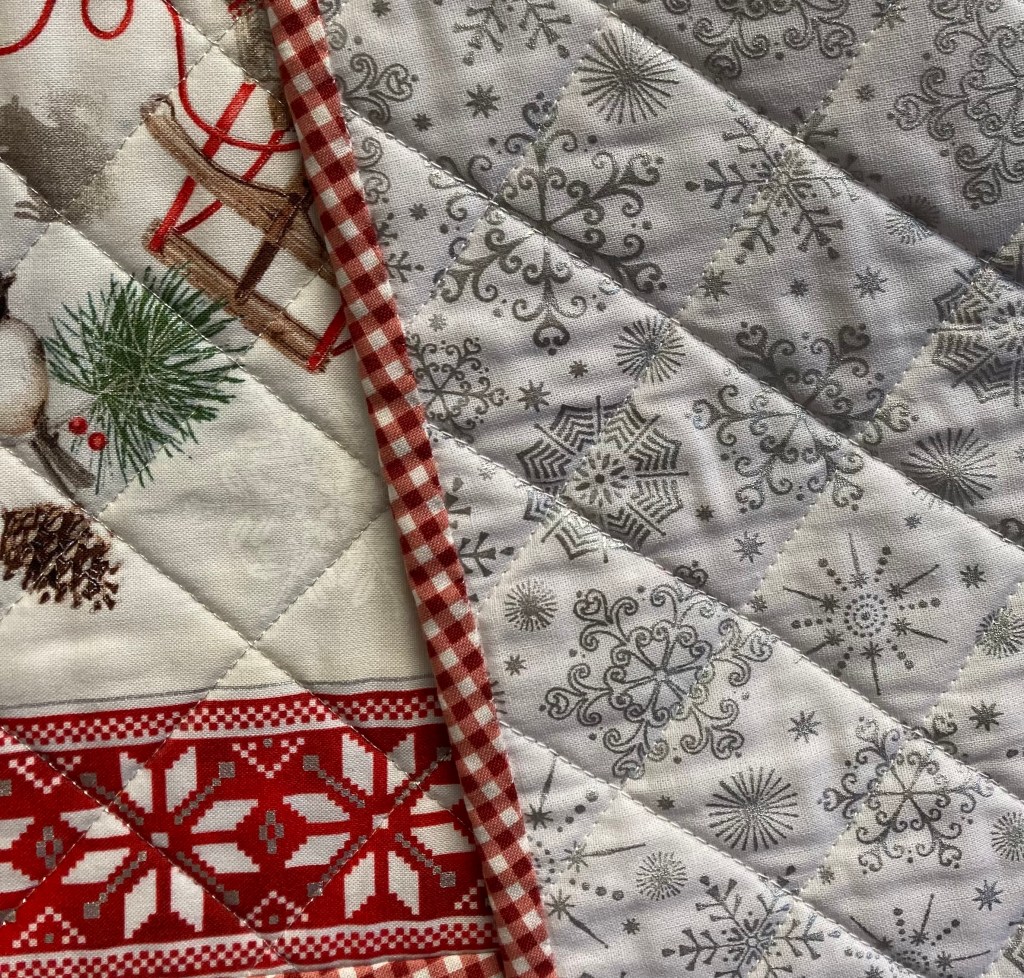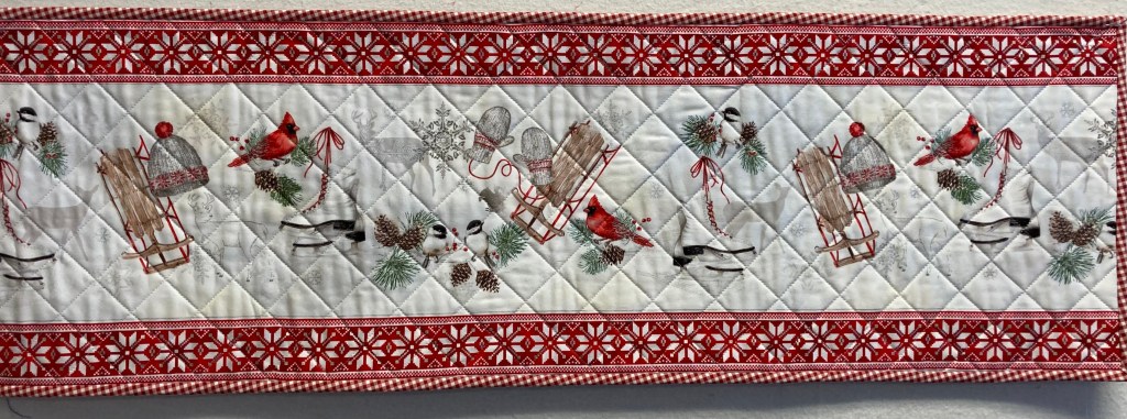 This 12.5″ x 39″ table runner isn’t just for the holidays–it is a winter table runner with the Nordic sweater pattern. It is cross hatch quilted by machine and the binding is hand sewn. SOLD