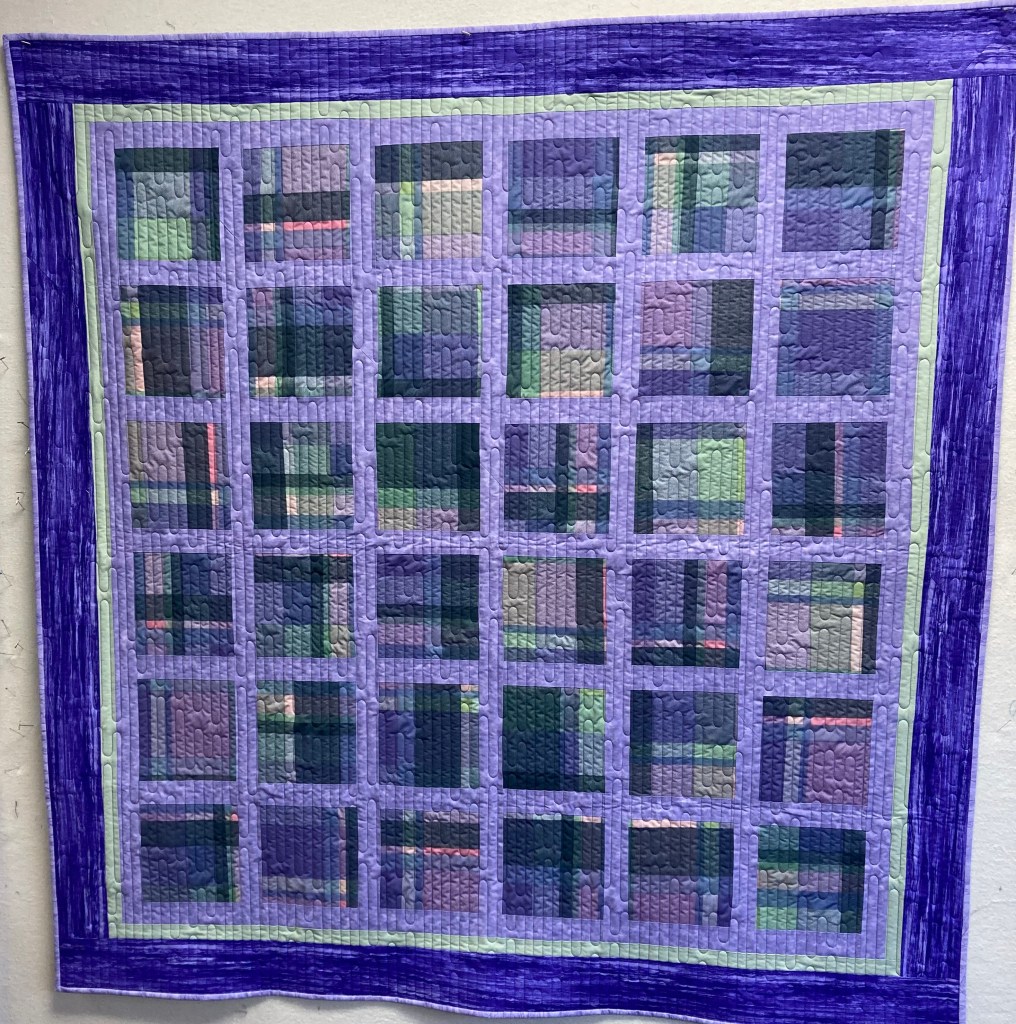 Paulette was given these “plaid” blocks and ask to do something with them. And look what she did! The lavender sashing, green and purple borders made this quilt outstanding. It is 57″ x 57″— lap size. Machine quilted, hand bound and very washable. It would be striking on the end of a bed or over the back of the sofa. $100.
