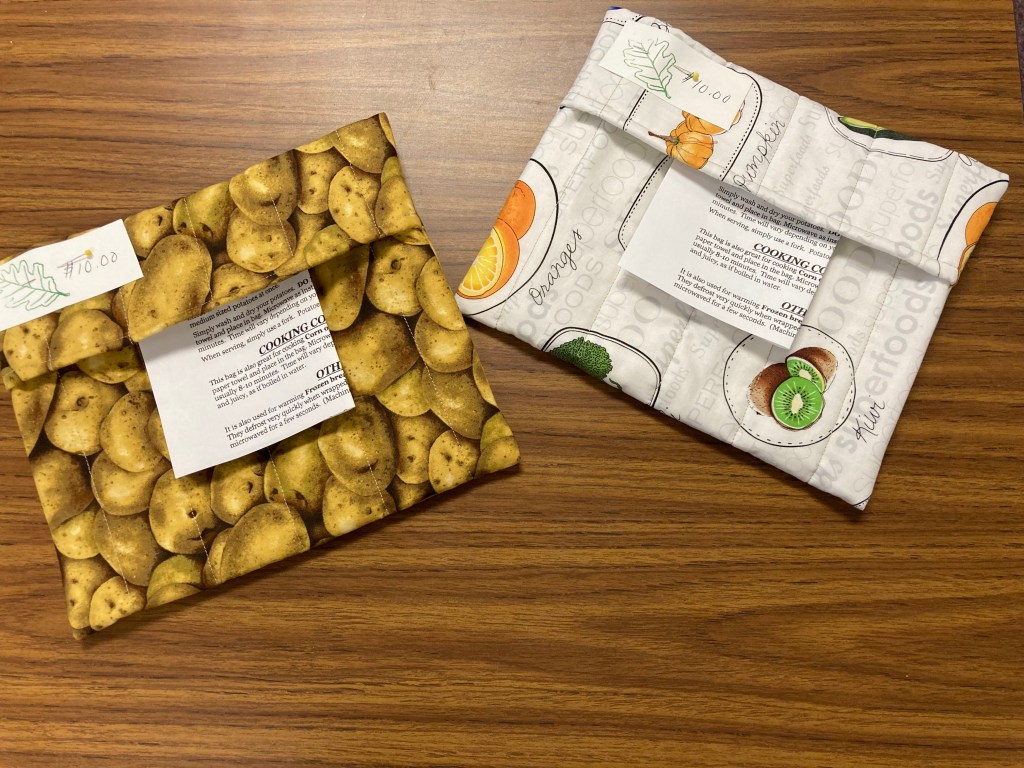 Baked potatoes are my “go to” meal in the winter–steaming hot potato with cheddar cheese, steamed broccoli and butter–the real stuff. That is a “fill you up” warm winter meal. These potato bags are designed to be used in the micro wave. We have 5 potato print bags and two white bags. $10 each. They come with detailed instructions.