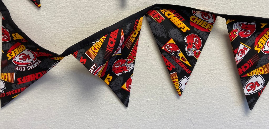 There are still lots of Sundays before the Super Bowl. Use this Chiefs pennant to decorate for your watch party, It has 10 flags — and is approximately 90 inches long. $15 (I have 3 for sale–2 black and 1 red.).