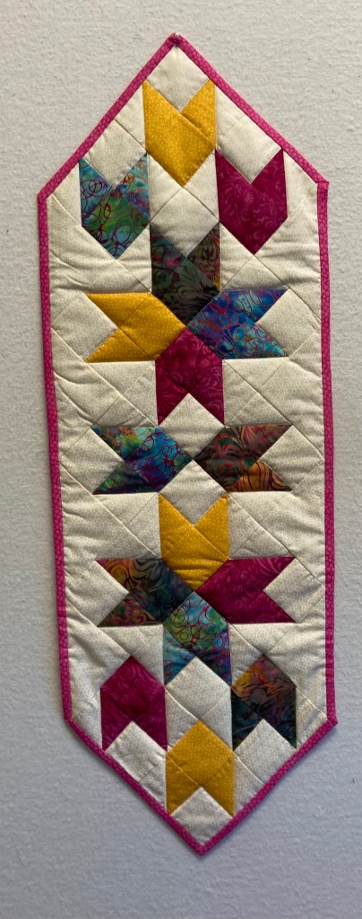 Batik fabrics were used to give this table runner its jewel tones. It is 12″ x 34″ and $40. Machine quilted and machine washable.