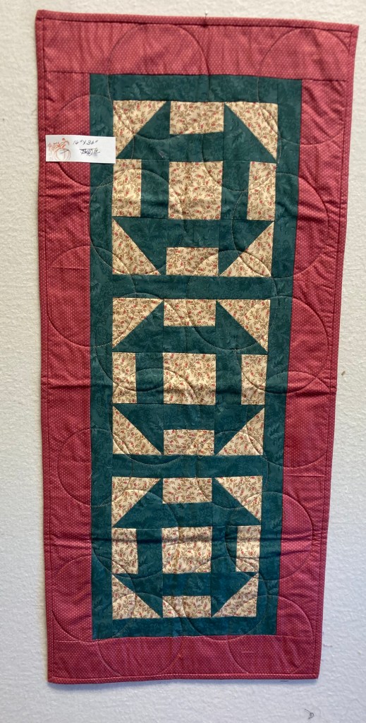 Churn dash is a very traditional pattern. The 16″ x 36″ table runner is machine quilted in a circle pattern. $40