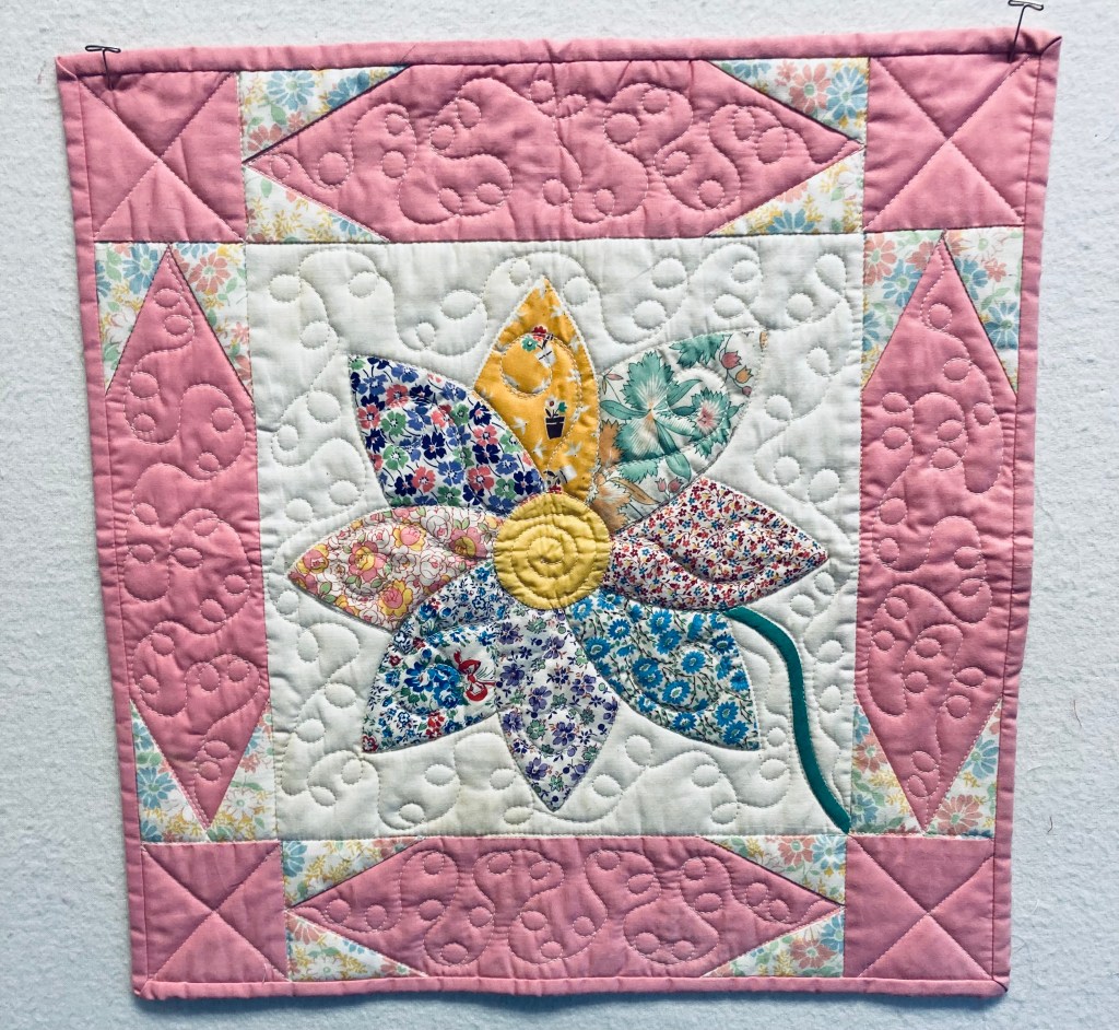A friend donated this charming table topper. The center is 30’s and 40’s reproduction fabric. Perfect setting for a lamp or vase of spring flowers. It is 17″ square and $25.
