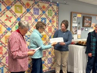 Wednesday, all the Quilters at First had lunch with Rev. Amy and Rev. Jeff, the Coffee Shop Women, representatives for the Religious Nurture Center (RNC) and Erin, the Church’s Director of Communications to officially present out gifts to the TV Ministry and to the RNC. After taxes and credit card fees were paid, we were able to give each $9,500.
