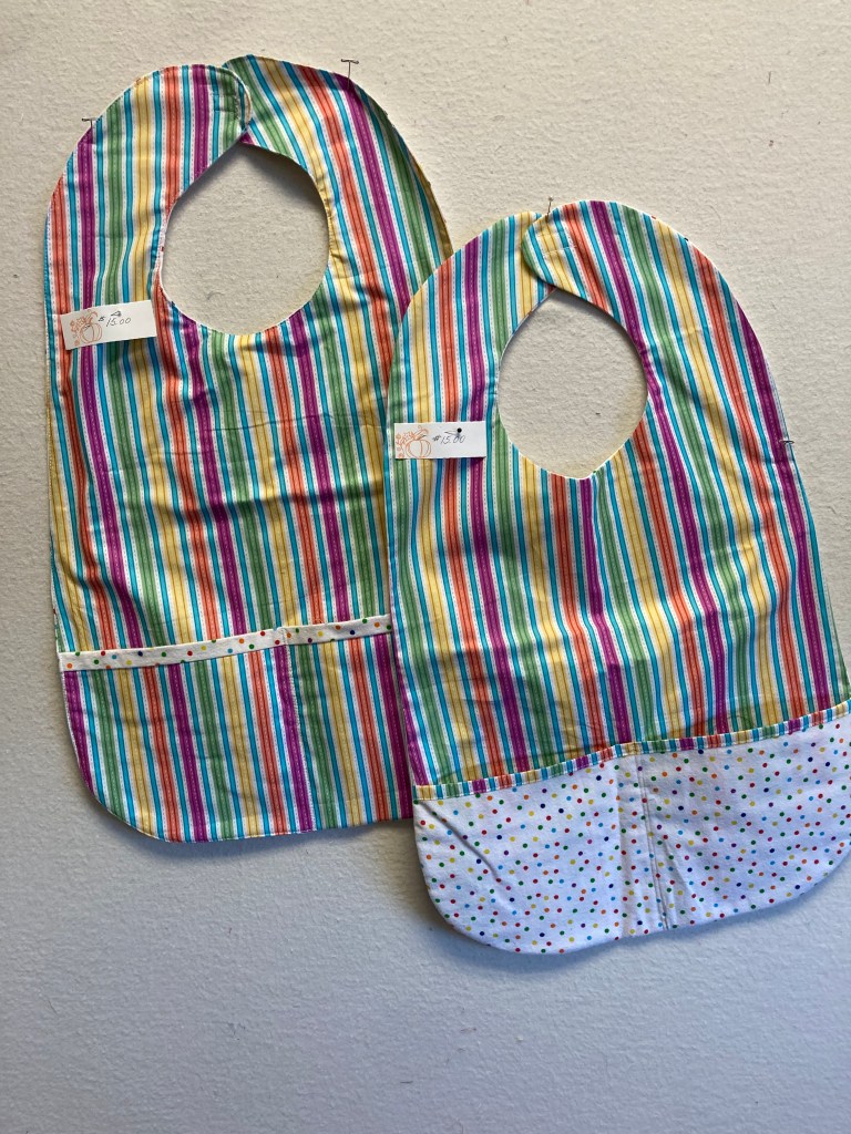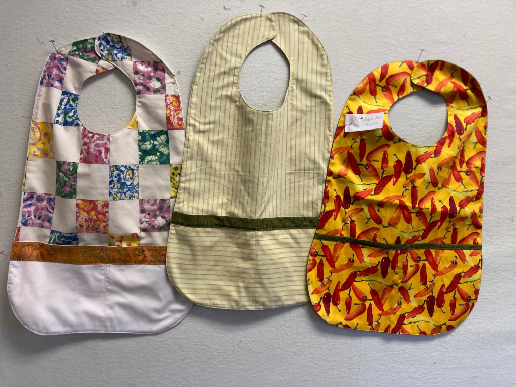 Diane saw the need for adult bibs–is there a better word? and created several different ones that can be for either male or female…all with donated fabric or fabric in her stash. $15 each