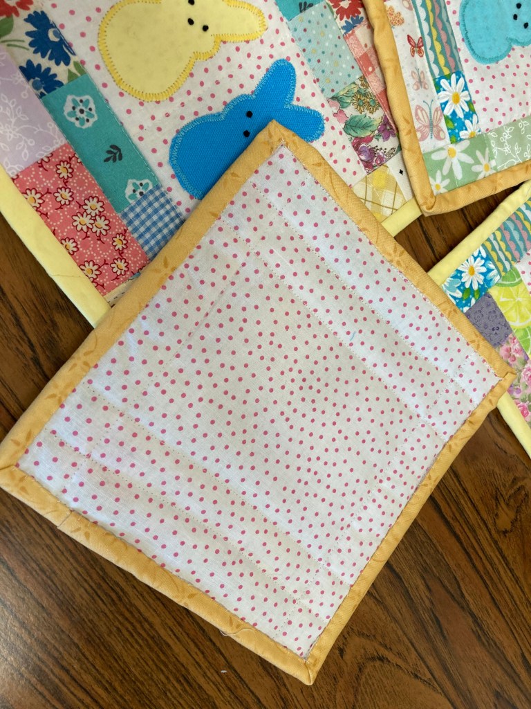 Peep mug rugs—or coasters if you like that term better. The bunnies are appliquΓ©d on the patchwork mat. $8 each