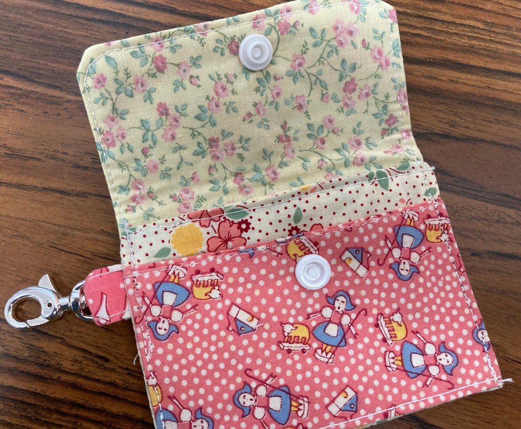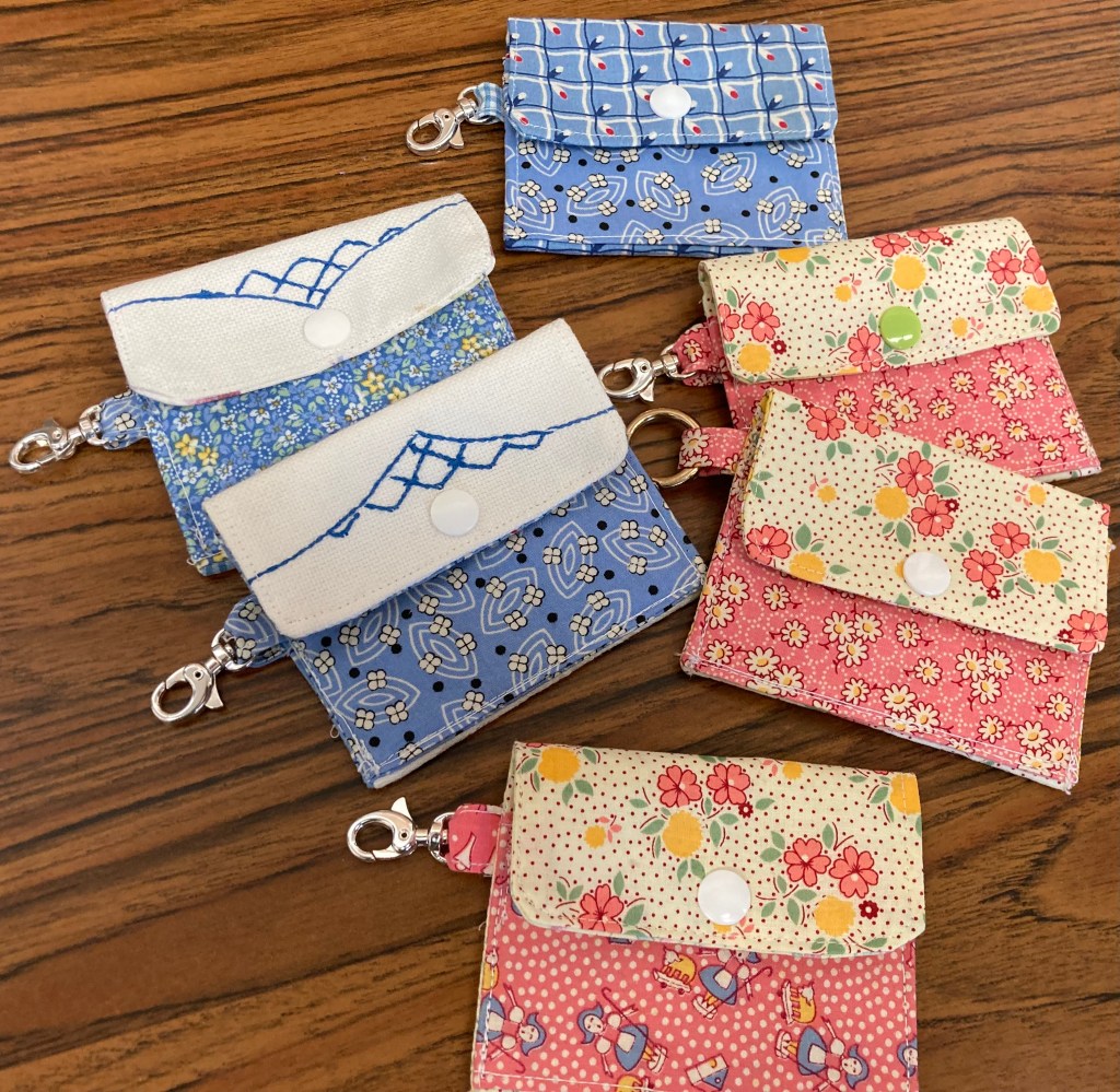 These little wallets with two pockets hook onto your lanyard , belt loop or purse. They snap close. Scraps of reproduction fabric and recycled linens were cleverly used. $10 each