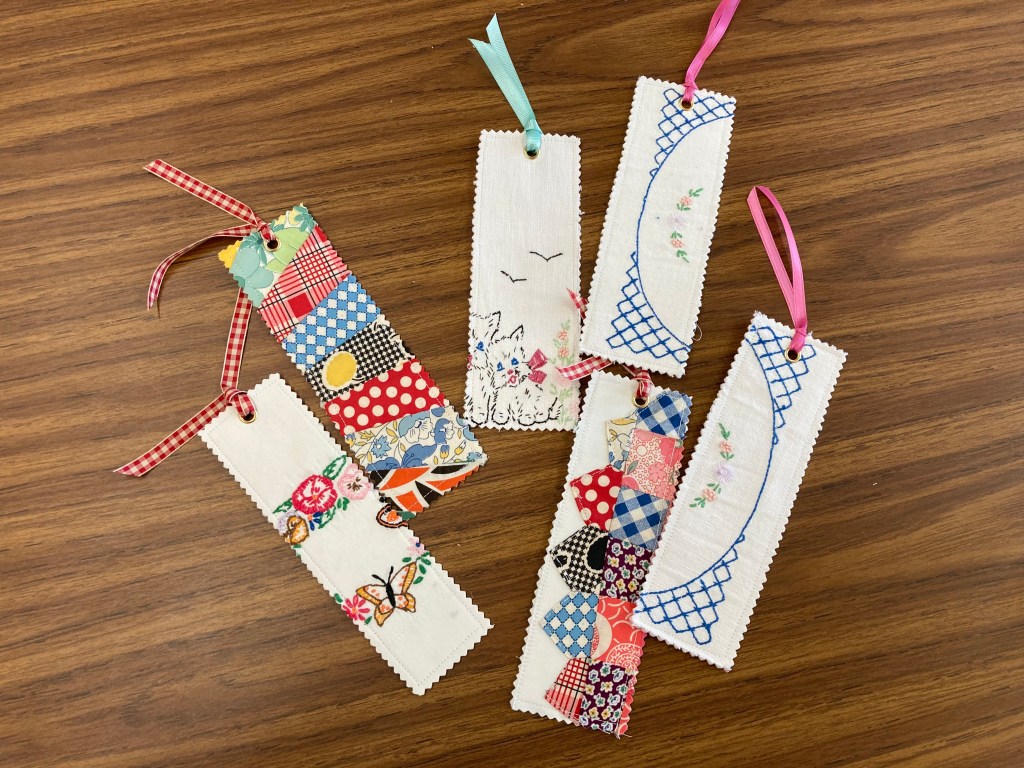 Book marks were made from old embroidered dresser scarves and patchwork pieces never quilted. They are sturdy with heavy interfacing sandwiched between the recycled fabric. $3 each