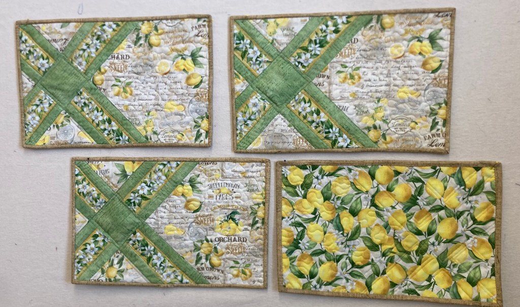 This set of 4 placemats is perfect for a summer luncheon or Sunday brunch. The coordinating print on the back allows them to be reversible. They are machine quilted and hand bound and of course, washable. The colors will work with many different types and sets of dinnerware. They measure 12″ x 19.5″ and are $40