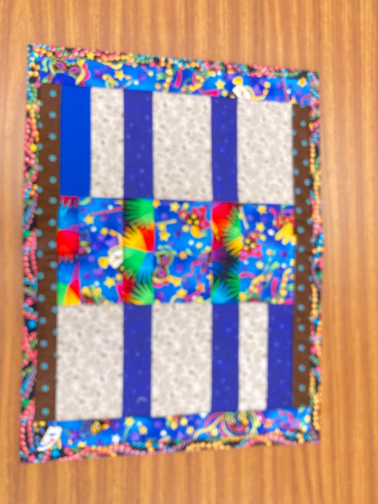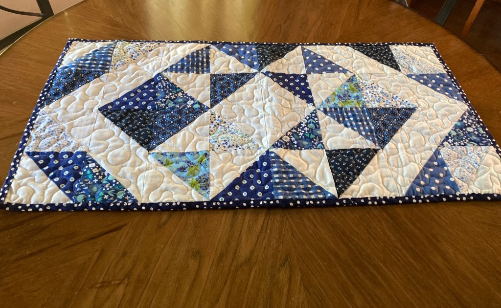 Blue on blue–A table runner made from various blue and white prints using the versatile half square block. It is machine quilted and bound. The backing is the blue and white polka dot fabric used for the binding. It is approximately 15″ x 30″ and is $40.