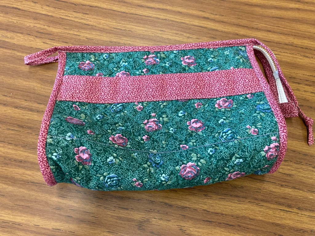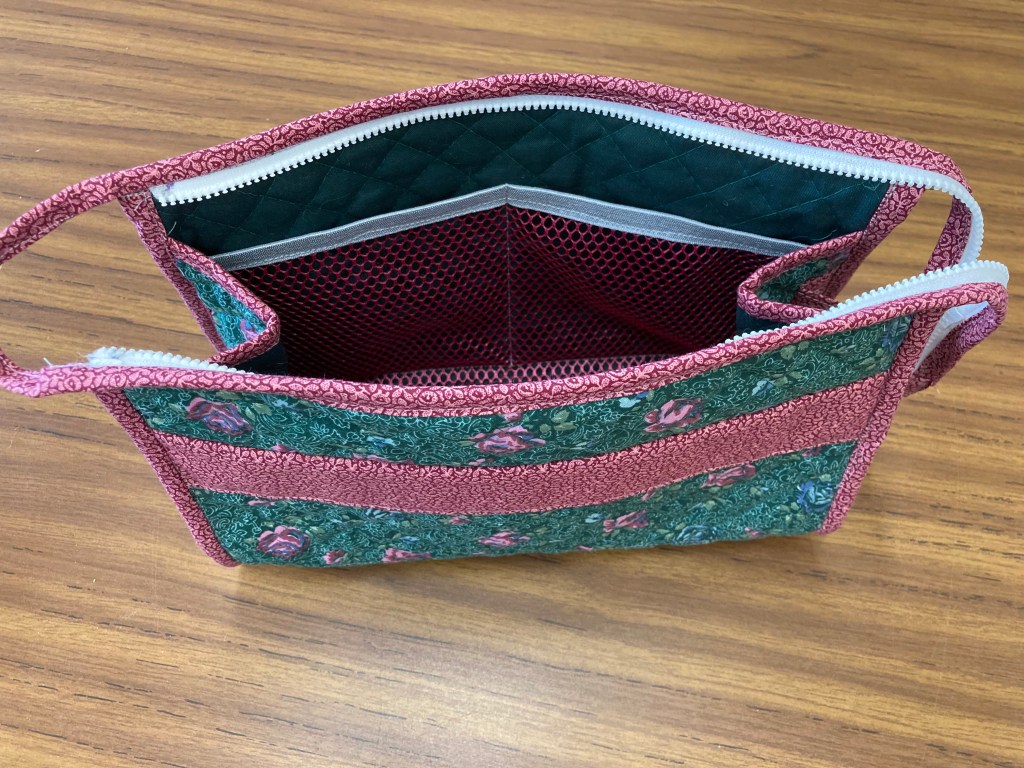 An another quilted bag with nifty mesh pockets on the inside. The zipper allows the bag to opened completely so that larger items may be placed inside. $40