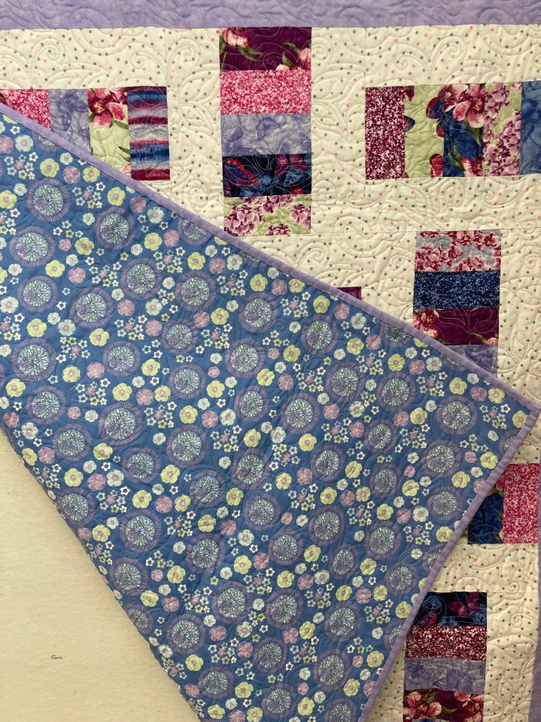 Lovely in lavender–this 50″ x 50″ quilt is the perfect lap or nap quilt. The background is my favorite pattern–polka dots! The quilt is machine quilted, machine washable and hand bound. $50