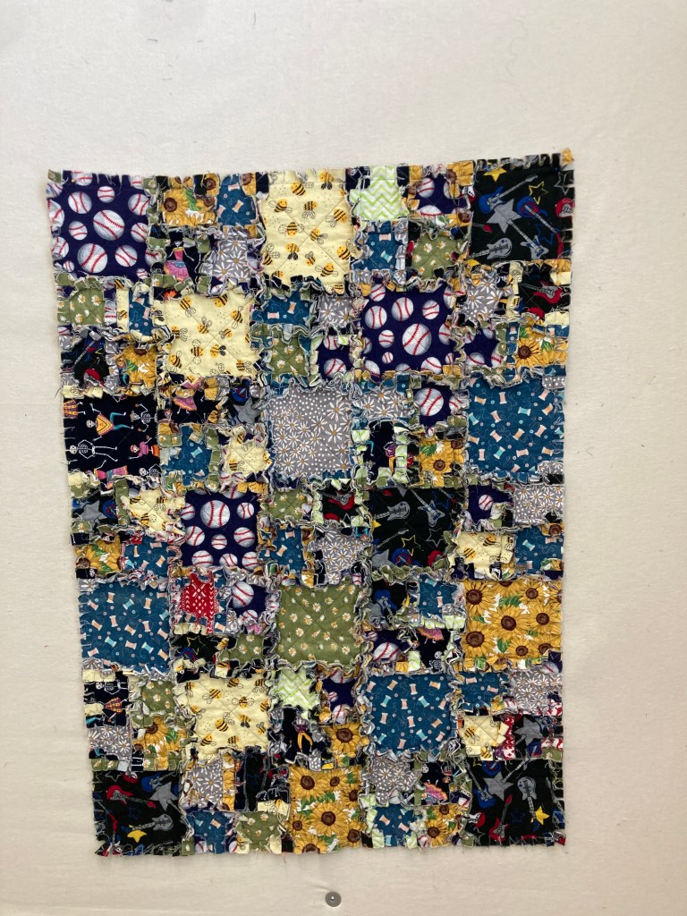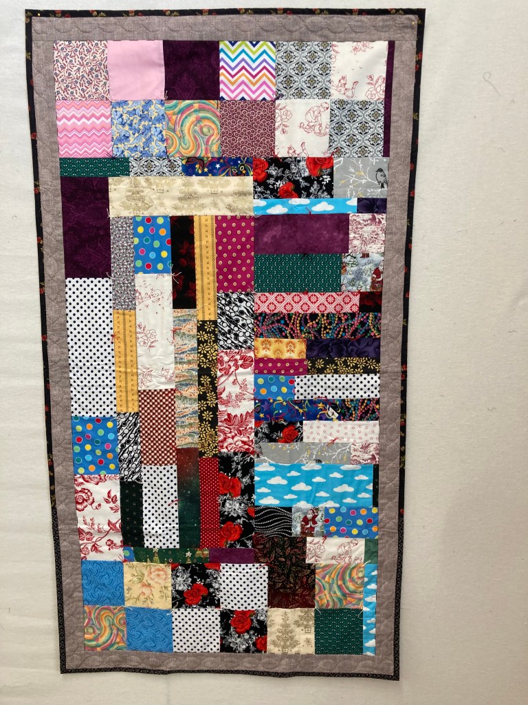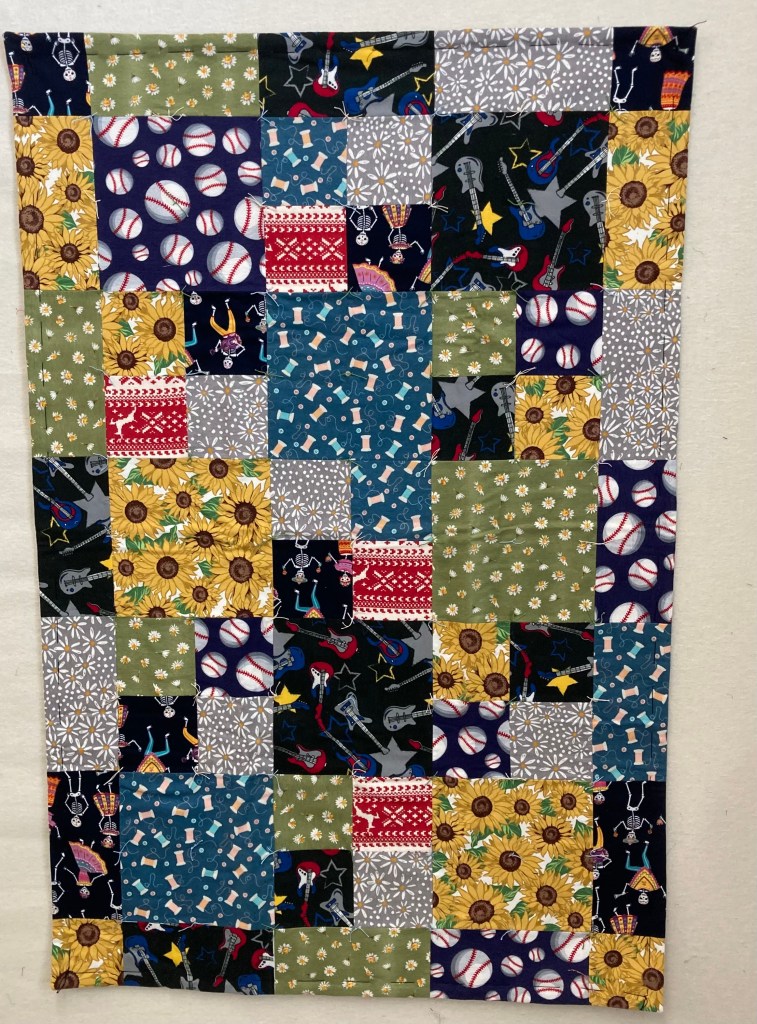 How does work? Team members use donated fabric–usually from other Guild members, to cut out pieces that are “kitted”–put in a zip lock with instructions. Any member can select a kit at a monthly meeting to assemble at home and return the top at a monthly meeting. Another member may select the top to machine quilt using batting and backing provided by the Prairie Quilt Guild . That person may bind the quilt to finish it or bring it back to another meeting where yet another member would take the quilt home to bind. Some quilts are completed entirely by one member while others may have had five or six persons contributing to the finished quilt.