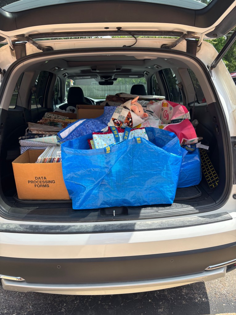 Shirley, a quilter with the Quilters at First and a team , makes a couple of trips north to the Kansas City area to buy a SUV full of batting on huge rolls which she hand cuts into the required sizes in her sewing studio.